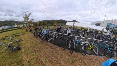 高級ロードバイクが居並ぶ中、エントリーロードで参加。鉄下駄ホイールにコンポーネントはSORA。装備込みの車重は約12kgと重め。服装も短パンとTシャツ程度。