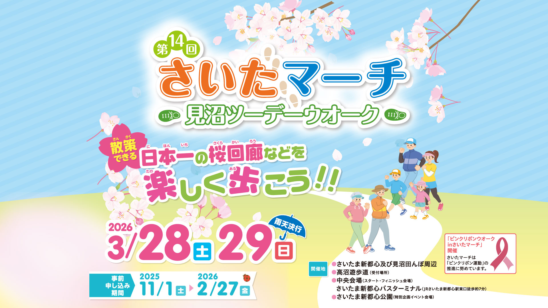 「さいたマーチ~見沼ツーデーウオーク~」は、さいたま新都心をスタート・ゴールとし、見沼田んぼの自然に親しみ、豊かな心と身体の健康づくりを目指すウオーキングイベントです。日本を代表するウォーキングリーグである日本マーチングリーグ(JML)の認定大会となっています。