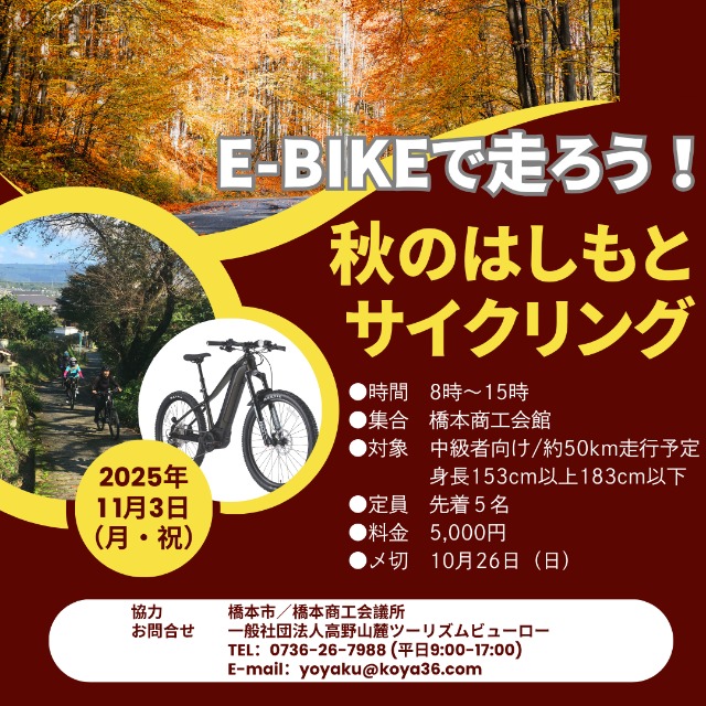 和歌山県橋本市で11/3(月・祝) に、中級者向けサイクリング企画「E-Bikeで走ろう!秋のはしもとサイクリング」を開催します。