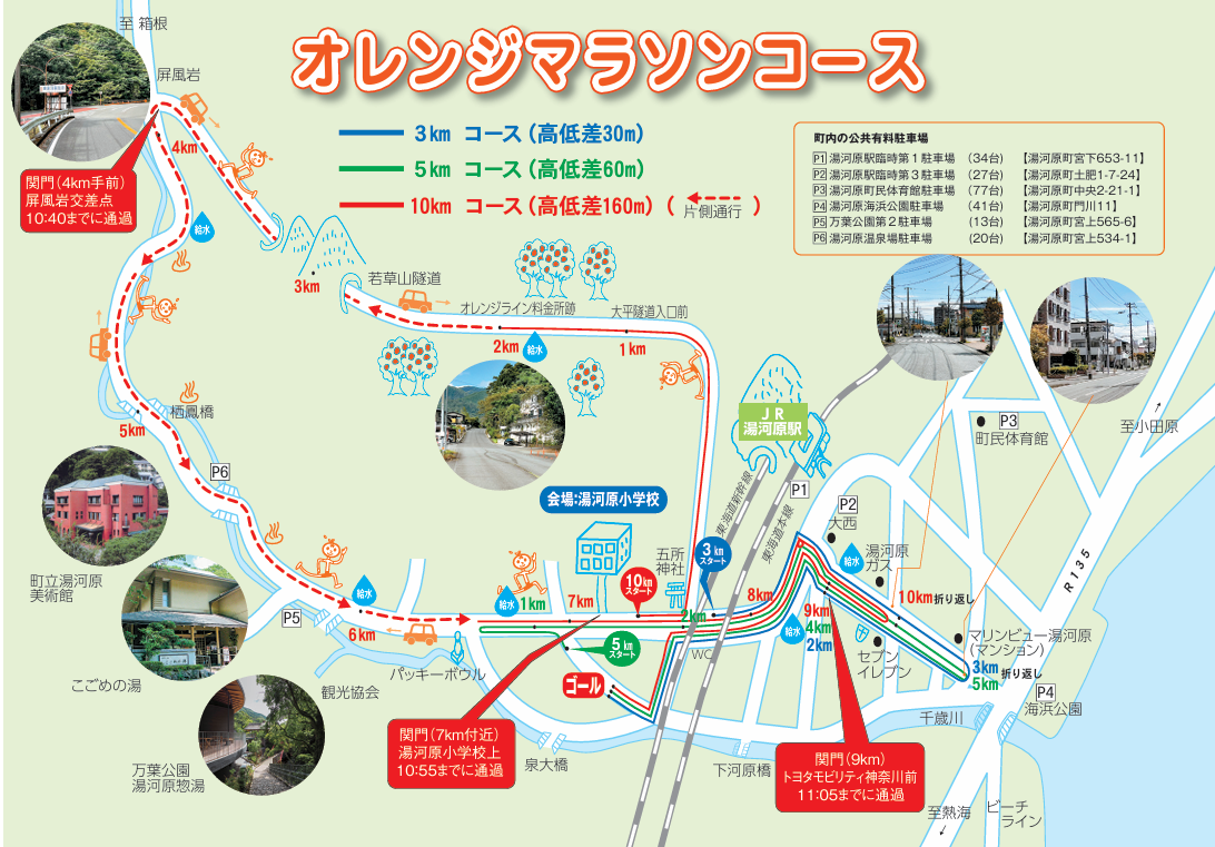 コースは町立湯河原小学校を中心とする周回コースで、コース沿いにはみかん畑や自然豊かな山々があり、昭和の風情が残る温泉街を走り抜けるというコースとなっており、3kmのペア・ファミリー、5km、10kmの部門です。
