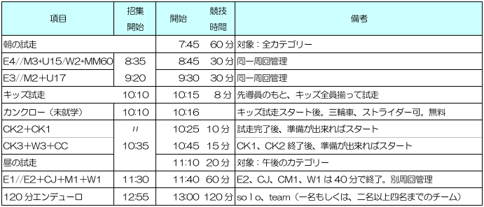 ※初めて参加される場合はE4又は、M3、W3(Wは女性)にエントリーしてください。カテゴリー名にMがあるのは35歳以上のマスタークラスです。E1、E2、E3、M1、M2についてはレース成績による昇格者が参加資格となります。女性、ジュニア以下の年齢カテゴリーについては年齢や経験に応じて各自の判断でエントリーしてください。MM60の内訳はA60-64、A65-69、A70-の3カテゴリーでカテゴリー別の表彰を行います(賞品はなし)。