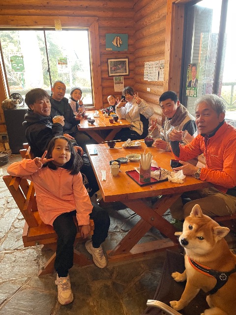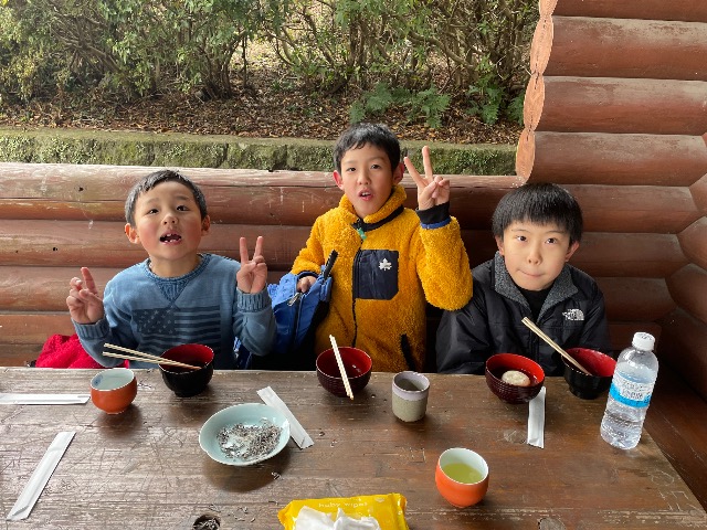 ⑥山頂で記念撮影後、森林つつじ公園の売店で美味しいぜんざいを食べる(塩こんぶ&お茶付き)