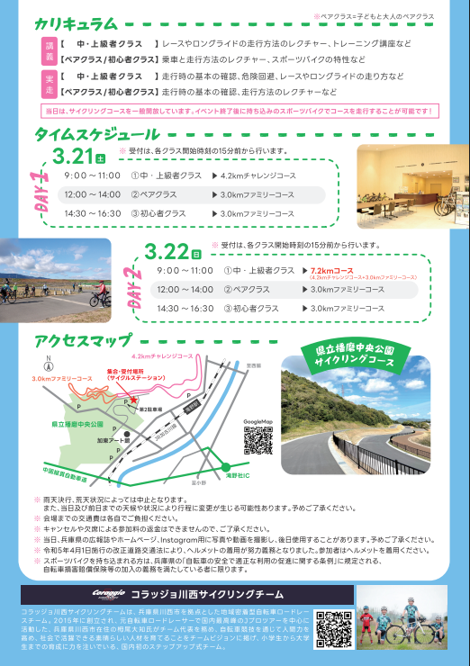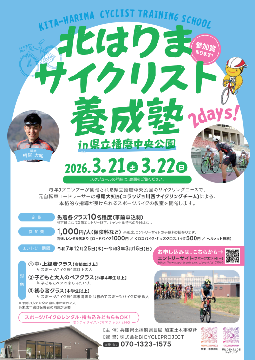今回、元自転車ロードレーサーで国内最高峰のJプロツアーを中心に活動した栂尾大知氏(コラッジョ川西サイクリングチーム)による、本格的な 指導が受けられるスポーツバイクの教室を開催します。