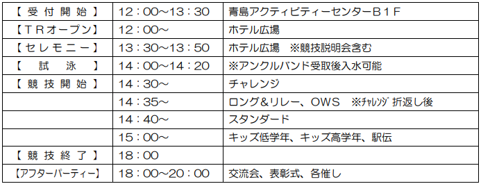 3. 「本大会」への参加には、大会主催者より示されている競技規則、スイムキャップ、ウェットスーツ等の使用器具の規格について、指示事項の尊厳が必要です。