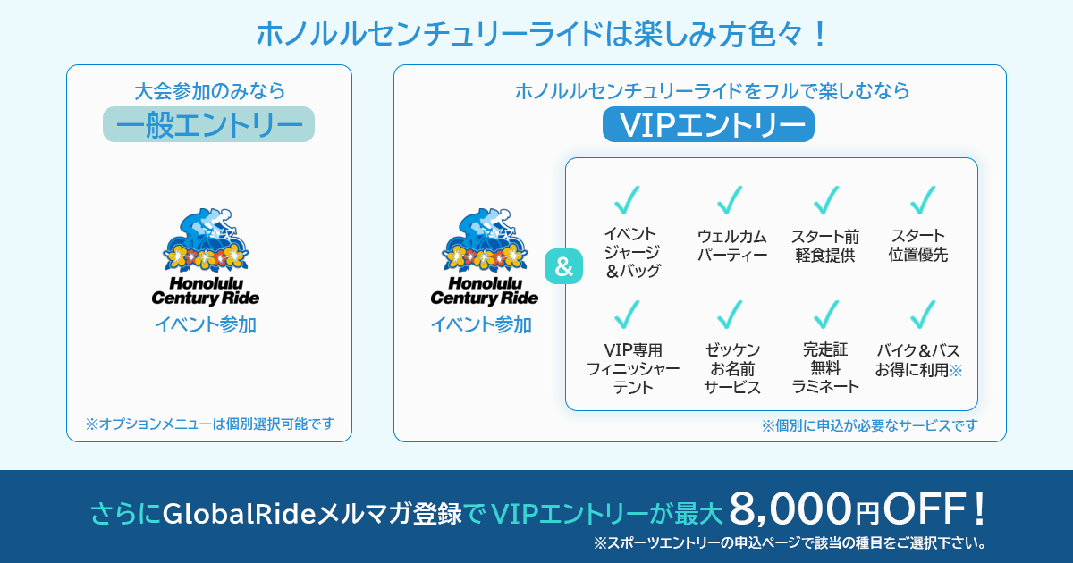 「VIPエントリー」の詳細はこちら「https://globalride.jp/honolulucenturyride/vipentry/」