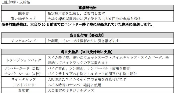 ※ナンバーカード、バイクステッカー、スイムキャップ等は選手受付時にお渡しします。