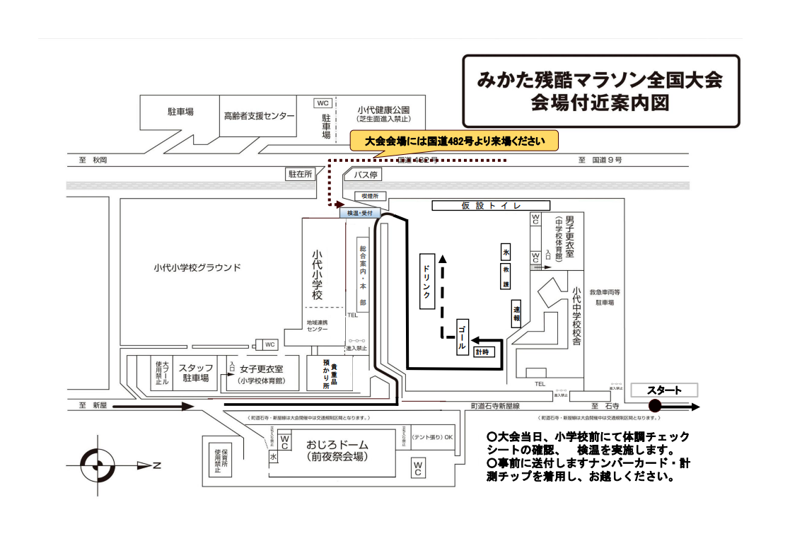 - ●ナンバーカードと計測チップを大会までに送付しますので、大会当日着用してスタート地点へお越しください。