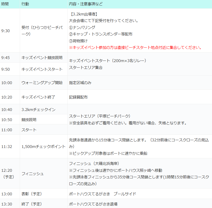 - 平塚側スタート会場と大磯側フィニッシュ会場の間、シャトルバスを無料で用意する予定です。お車でお越しの選手やご家族の応援等でご利用いただけます。なお、会場移動のスタッフを優先させていただきますのでご理解をお願いします。