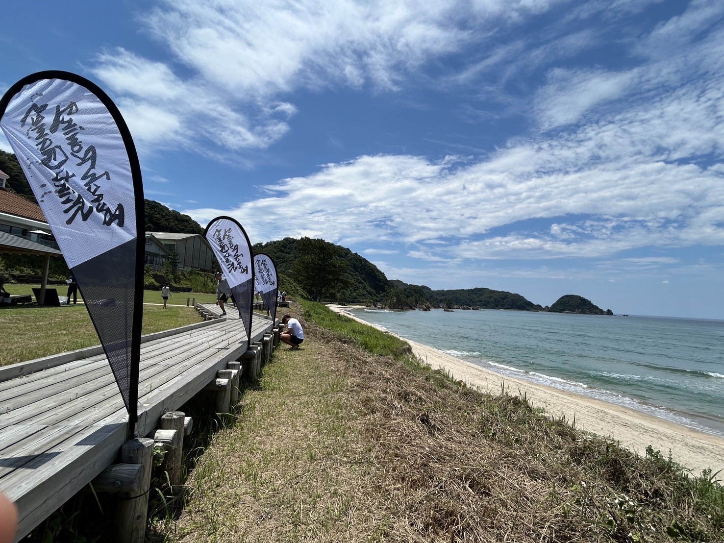 ビーチフラッグス形式とし、各クルー用の砂浜に直立に建てられた1本の旗にタッチしなければならない。