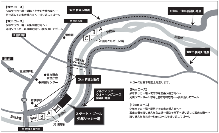 市民による手づくりのお祭りとして北海道を代表するお祭り「北海へそ祭り」の開催にあわせ、マラソンを通した体力づくりと参加者の交流を目的に、空知川河畔の自然を満喫しながら十勝岳連峰や芦別岳の大パノラマが楽しめる空知川河畔コースにおいて開催する。