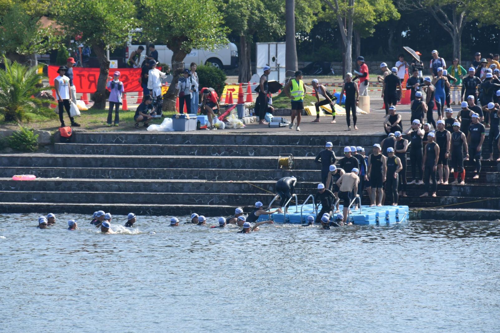 2.スイムではウェットスーツ、トライスーツ、水着等の適切なウェアを着用してください。(暑さ対策の為、ウェットスーツは袖の無いものを推奨します。)Tシャツやラッシュガードは禁止とします。