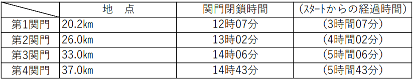・各関門通過後、次の関門閉鎖時刻に間に合わないと思われる競技者は途中でレース中止を命じることがありますので、指示に従ってください。