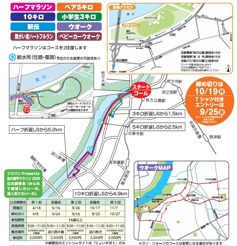 コースとなる淀川河川敷にある河川公園は、豊かな自然と水の恵みにあふれる国営公園です。中でも広大な広場を有する枚方地区をメイン会場とし、淀川左岸に特設コースを設定します。土曜日は小学生3キロ、ベビーカーウオーク、ペア5キロ、ウオーク、障がい者ハートフルラン、日曜日はハーフマラソン、10キロ、駅伝を実施、合計9,000人の参加者を募集します。
