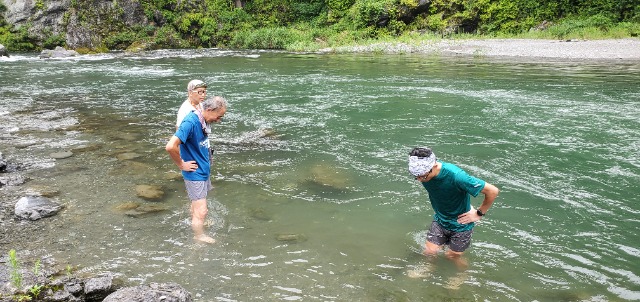 ランニング終了後、筋肉痛予防、疲労回復の為にストレッチ、川で天然のアイシングします。