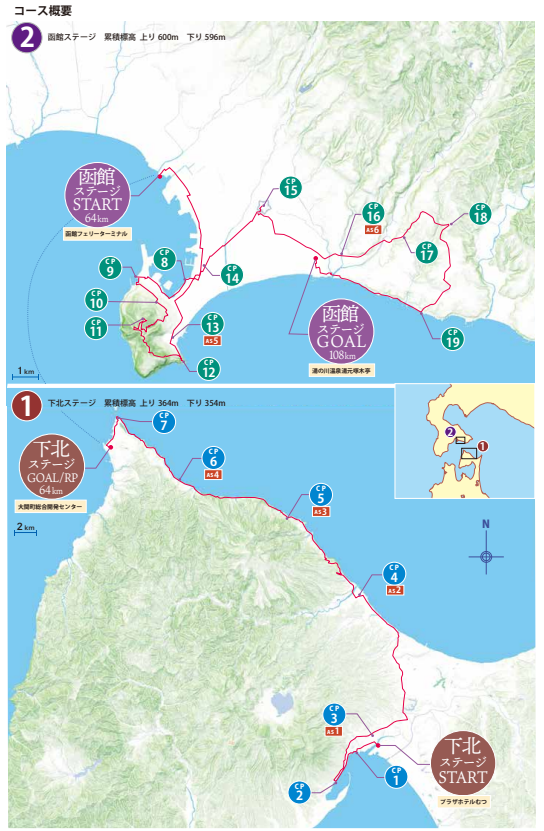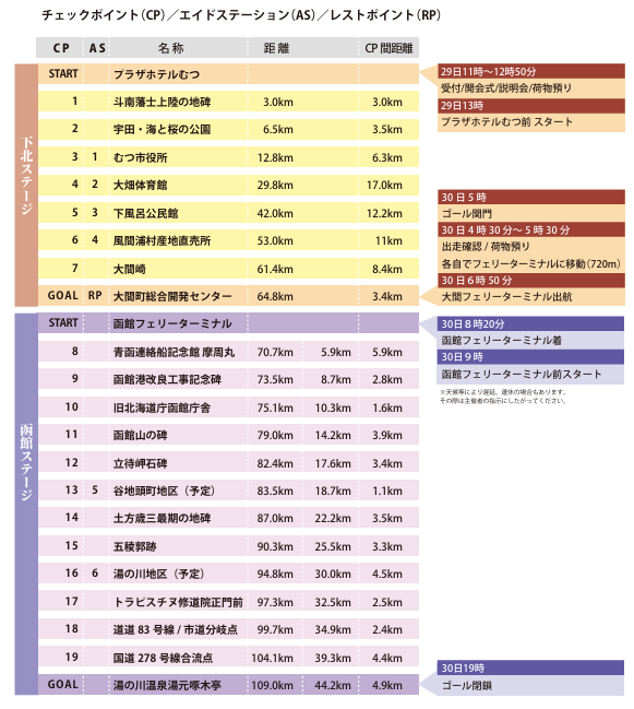 ■2ステージ制になります。下北ステージは8月29日13 時に「プラザホテル むつ」前をスタートし、「大間町総合開発センター」がゴールとなります。函館ステージは8月30日に下北ステージゴール地点の「大間町総合開発センター」で出走確認を受けた後、フェリーで移動し、函館フェリーターミナルから再スタートとなります。