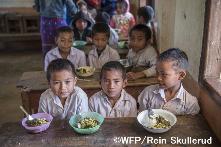 国連WFPは、2017年60カ国で1,830万人の子どもに学校給食や持ち帰り食料を提供しました。