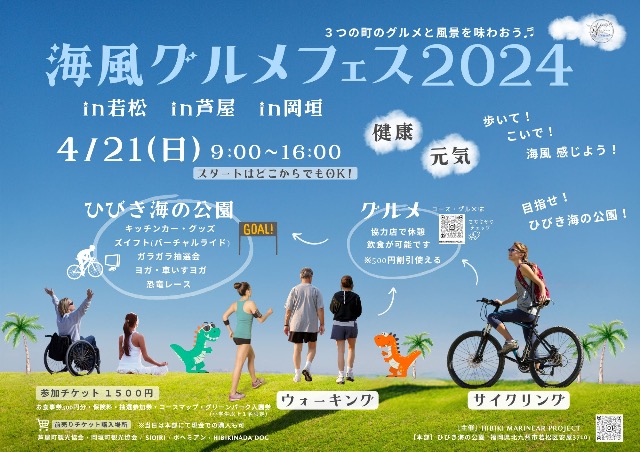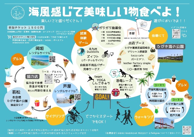 1.芦屋・岡垣(玄界灘・響灘海岸)・若松(若松北海岸)の海沿いの景色と海風を感じながら、サイクリングやウォーキングをゴール(ひびき海の公園)を目指して楽しみます。スタートはどこからでもOK!途中でお好きなグルメを探しながらまわってみましょう。グリーンパーク内も入場可能となります。チケットをご提示ください。サイクリングの方は北ゲートの特設駐輪場をご利用ください。