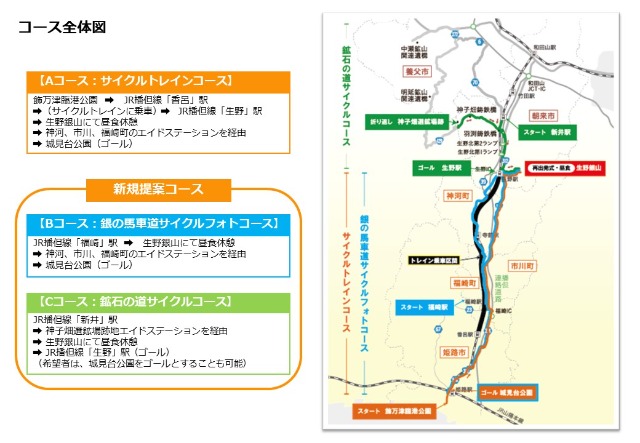 - 兵庫県①サイクルトレインコース スタート/飾万津臨港公園(姫路市) ゴール/城見台公園(姫路市) ②銀の馬車道サイクルフォトコース スタート/JR播但線福崎駅(福崎町) ゴール/城見台公園(姫路市) ③鉱石の道サイクルコース スタート/JR播但線新井駅(朝来市) ゴール/JR播但線生野駅(朝来市)