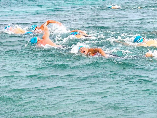 [競技方法]第1泳者は水中のスタートラインから一斉スタートし、1周500mのコースを1周して指定ゾーンで待つ第2泳者にハンドタッチして2泳がスタートする。同様に3泳、4泳へと引継ぐ。4泳の陸上ゴール地点への到着をもって競技終了とする。