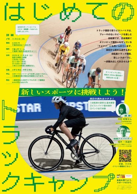 全国に3つしかない250m競技場のひとつ「千葉JPFドーム」で、 子どもたちがピストバイクに乗って“走る楽しさ”を体験できるイベント 「トラックキャンプ(はじめてのピストバイク)」を開催! 自転車トラック競技は…