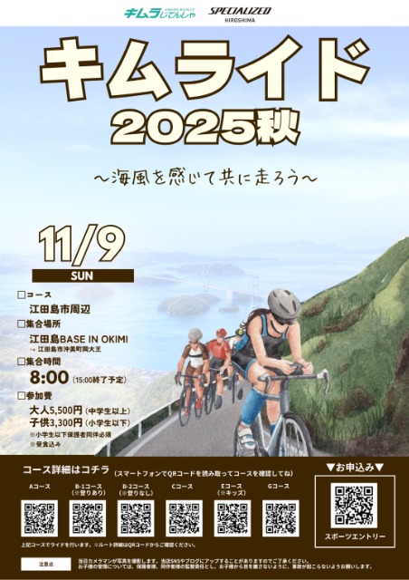 今年も開催します!『キムライド2025秋』 今回のコースは江田島! 美しい海・空、そして島の景色。心地よい風を感じながら一緒に走りましょう(^^) 今回は5つのコースを準備しております! 【Aコース 王道!ハッ…
