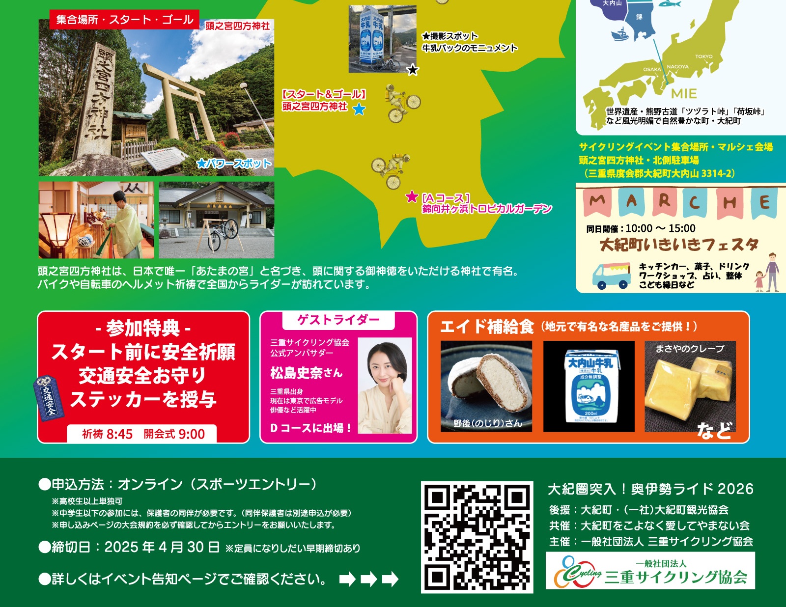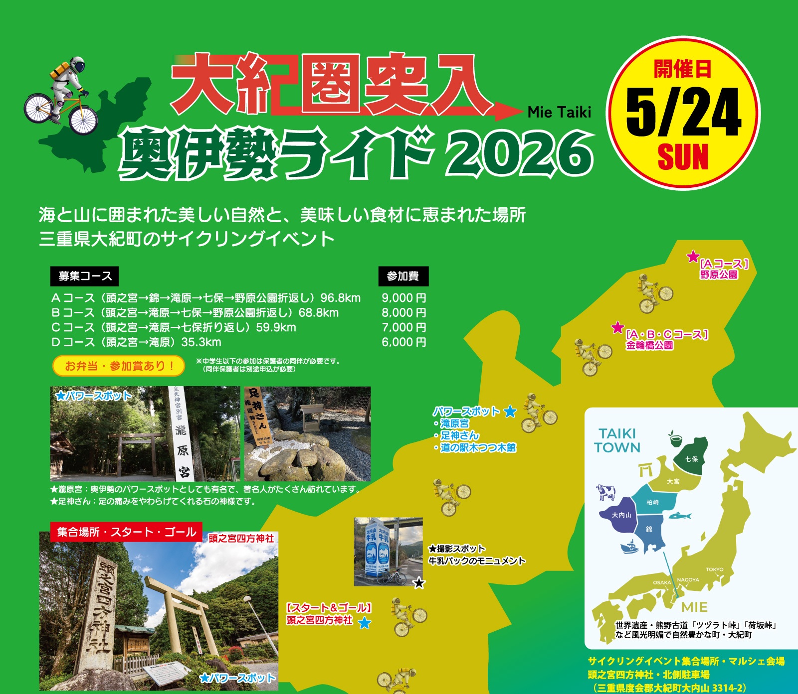 海と山に囲まれた美しい自然と、美味しい食材に恵まれた場所 「三重県大紀町」でサイクリングをしませんか? ●同日開催:大紀町いきいきマルシェ ●高校生以上単独可 ※中学生以下の参加には、保護者の同伴が…