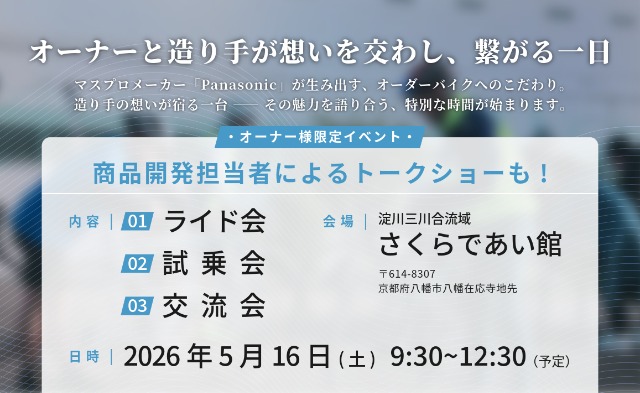 <オーナー様限定イベント> オーナーと造り手が想いを交わし、繋がる一日。 マスプロメーカー「Panasonic」が生み出す、オーダーバイクへのこだわり。 造り手の想いが宿る一台 ―― その魅力を語り合う、特別な時…