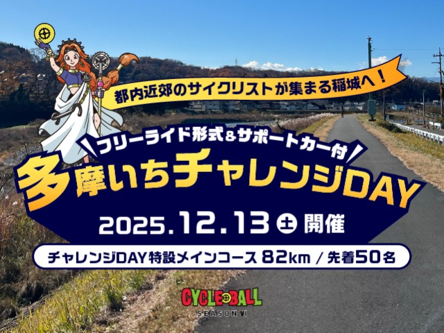 \今期初登場ステージ!東京都多摩エリアを走ろう/ サイクルボール 多摩いちチャレンジDAYの開催が決定! 今回は、多摩いちメインコース約82kmが舞台です。「稲城北緑地公園」を発着点に、多摩エリアの2大ルート…