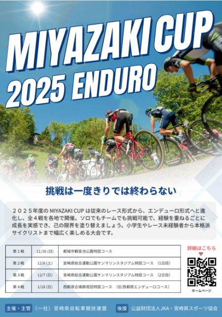 宮崎県内にて年間4戦開催されるエンデューロ大会となります。 全4戦を通して年間チャンピオンの称号を授与します。 第1戦 令和7年11月16日(日)都城市エリア大会 第2戦 令和7年12月6日(土)宮崎市エリア大会 …