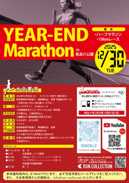 2025年ラストラン!「イヤーエンドマラソン2025in岐阜」開催!種目はハーフマラソンと10km。コースは1周2.5kmの周回コース。仲間と共に一年を振り返りながら、走りで締めくくる特別なひとときを、ぜひ長良川でお過…