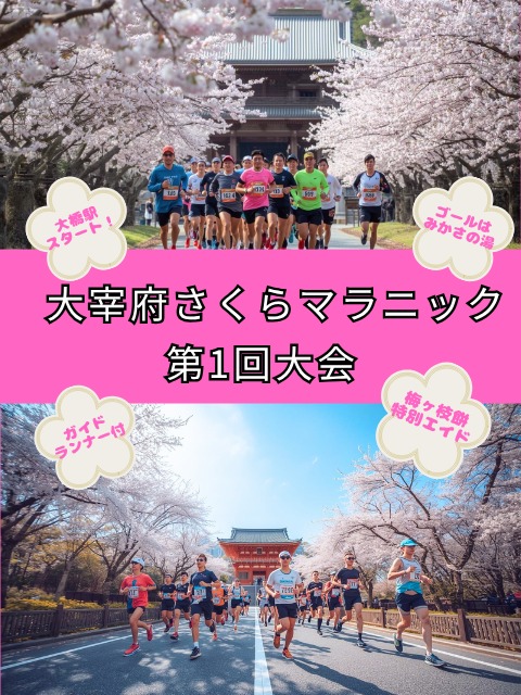 記念すべき第1回大会!大橋駅発、走力に応じた組み分けを行い、桜満開の街並み、桜並木スポットを巡り、花見スポットで休憩・給水しながら、特別エイドで「梅ヶ枝餅」で元気を補給、ゴールの大宰府市唯一の天然温泉…