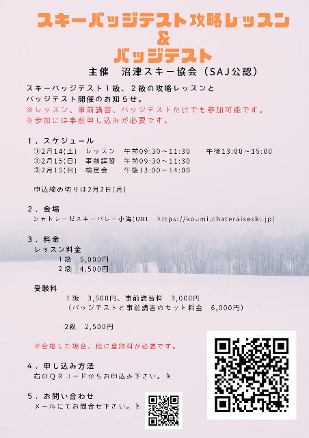 スキーバッジテスト1級、2級の攻略レッスンとバッジテストを行います。 ※レッスン1日、事前講習(1級受験者)、バッジテストだけでも参加可能です。 スケジュール ①02月14日(土) レッスン 午前09:30~11:3…