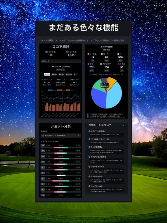 まだある色々な機能/ラウンド履歴、スコア統計、ショット分析機能付き。オプションで弾道・ミスの登録も可能。