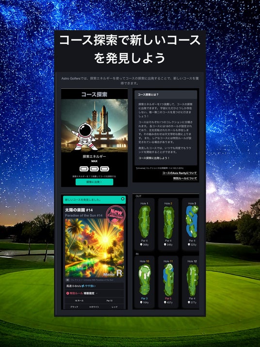 コース探索で新しいコースを発見しよう/Astro Golfersでは、探索エネルギーを使ってコースの探索に出発することで、新しいコースを獲得できます。