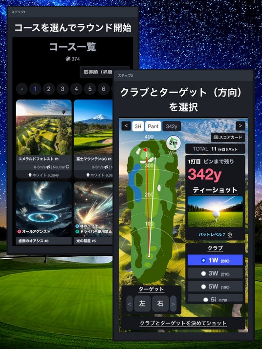 『Astro Golfers』は、ゴルフ練習場や自宅など、測定器を使わず簡単な入力で本格的なラウンド体験を楽しめる、まったく新しいタイプのアプリです。