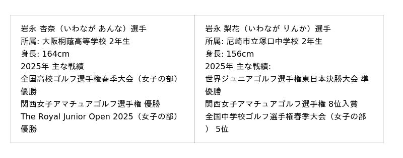 - 姉妹そろって尼崎から世界へ!春の全国高校ゴルフ優勝の岩永杏奈(高2)、妹・梨花(中2)と姉妹で「世界ジュニア」へ。尼崎で祝賀会28日開催。