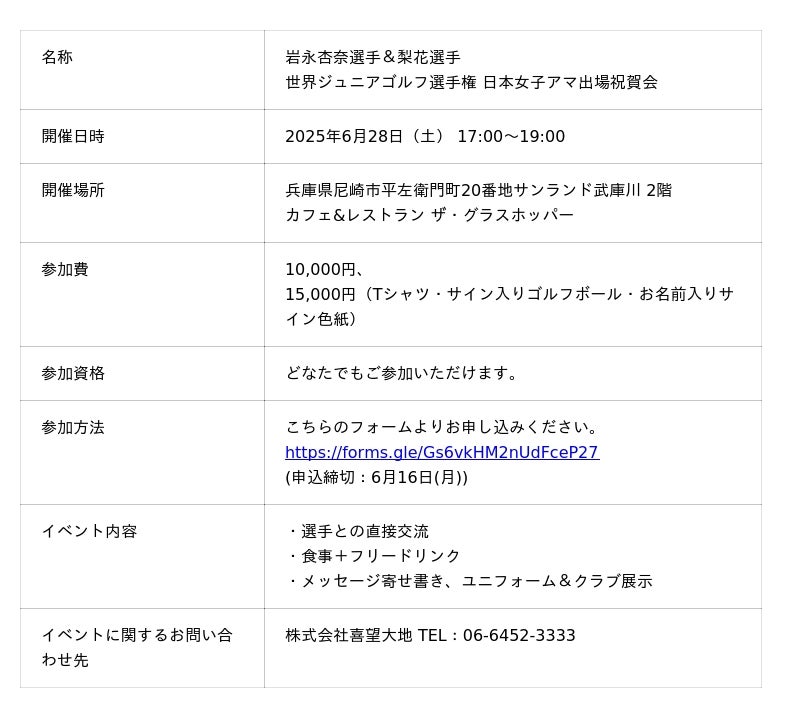 株式会社喜望大地(本社:大阪市北区)は、スポンサーを務めるアマチュアゴルファー岩永杏奈選手・梨花選手の「世界ジュニアゴルフ選手権・日本女子アマ」出場を祝い、渡米前の両選手を激励するイベント「岩永杏奈選手&梨花選手世界ジュニアゴルフ選手権日本女子アマ出場祝賀会」を2025年6月28日(土)に開催します。