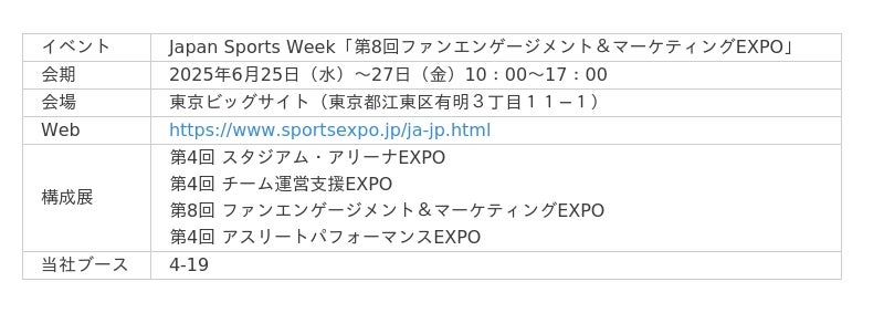 最先端のAI を活用したスポーツ動画コンテンツ自動生成の世界的リーダー、2025年6月25日(水)~27日(金)の3日間、東京ビッグサイトで開催される「Japan Sports Week 第8回ファンエンゲージメント&マーケティングEXPO」に出展いたします。
