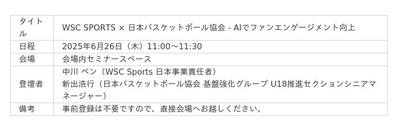 また、6月26日(木)11:00からは、日本バスケットボール協会の新出浩行氏をゲストに迎え、「WSC SPORTS × 日本バスケットボール協会 - AIでファンエンゲージメント向上」と題したセミナーを開催いたします。