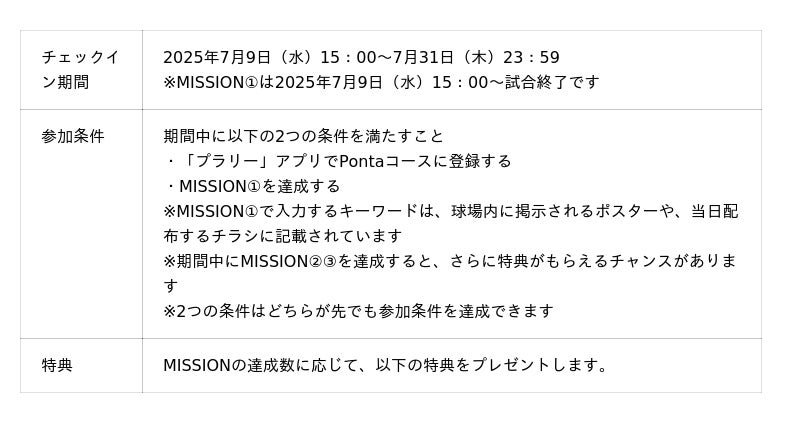 さらに、対象のバファローズ☆ポンタコラボメニューを購入した方に、購入特典として「クリアトレカ」をプレゼントする他、Ponta公認ポイ活アプリ「プラリー」で球場内のスポットでチェックインした方にもれなく観戦記念のNFTや50Pontaポイントをプレゼントするキャンペーンを開催します。計3カ所以上にチェックインした方には、抽選でバファローズ☆ポンタグッズや、選手のサイン入りユニフォームをプレゼントします。