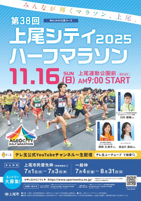 上尾シティハーフマラソン実行委員会(大会会長:畠山稔、大会実行委員長:柳瀬義弘)は、7月1日(火)から「第38回2025上尾シティハーフマラソン」〔2025年11月16日(日)開催〕の参加ランナー募集を開始いたします。7月1日(火)~3日(木)は上尾市民のみの優先募集となり、4日(金)から一般募集が行われます。応募締め切りは8月31日(日)。定員になり次第締切となります。なお先行募集の上尾市民優先枠の先着500名の方には特典も。詳細は大会公式HP(https://ageocity-marathon.com/)。