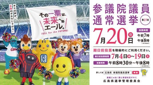 広島県民に親しまれているプロスポーツチームの人気マスコットたちが、若年層や子育て世代を中心に幅広い世代に投票を呼びかけます。