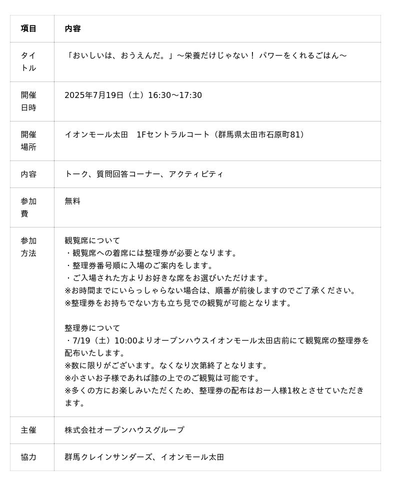 株式会社オープンハウスグループ(本社 東京都千代田区、代表取締役社長 荒井正昭、以下「当社」)は、挑戦する人の思い出に残る料理をエピソードと共に紹介することで、応援する気持ちや人とのつながりの大切さをお伝えする「応援メシ」の取り組みの始まりを記念して、プロバスケットボールチーム群馬クレインサンダーズとコラボレーションをし、7月にイオンモール太田(群馬県太田市石原町81)にて、下記のイベントの開催を決定しました。