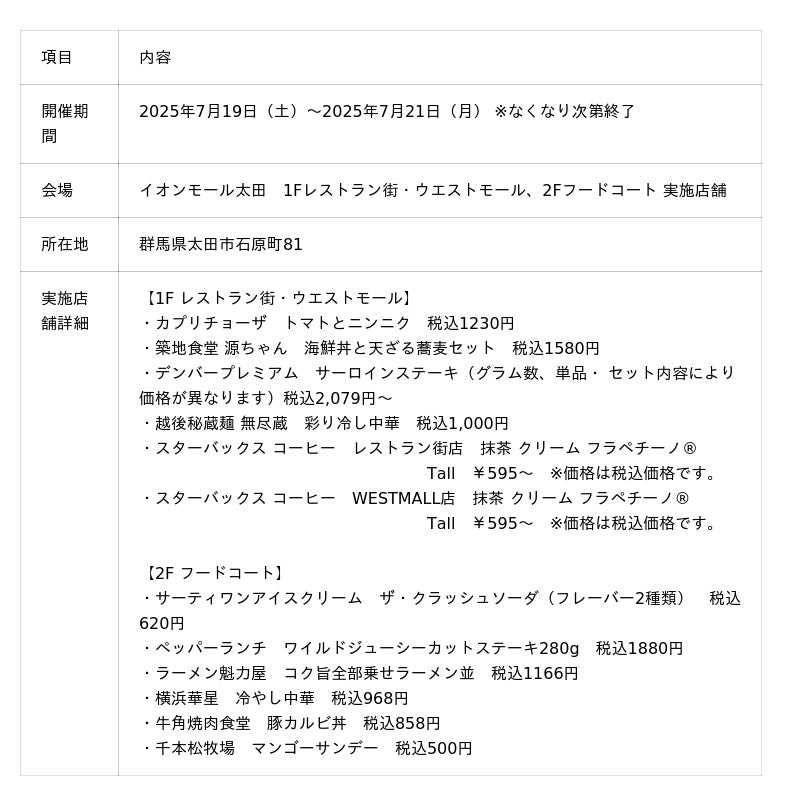 また、本プレゼントキャンペーンでお配りするイベント限定デザインカードは、イオンモール太田のフードコート・レストラン街・ウエストモールの飲食店舗さまのご協力により実現した企画で、群馬クレインサンダーズの選手・ヘッドコーチの思い出に残るごはんのエピソードが書かれています。カードは全部で8種、誰のカードが当たるかはご購入後のお楽しみとなっております。