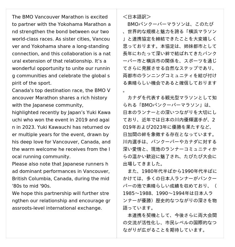 川内優輝選手コメントバンクーバー市と横浜市の姉妹都市締結60周年という記念すべき年にバンクーバーマラソンと横浜マラソンの提携実現の橋渡しができたことを大変嬉しく思います。そして「マラソンは国境を越える」という言葉を実現して下さったバンクーバーと横浜のマラソン関係者の皆様の御尽力に感謝を申し上げます。5月のBMOバンクーバーマラソンと10月の横浜マラソンは時期的に競合関係にないため、今回の連携によって大きな相乗効果を生む可能性を秘めていると思います。今後、両市のマラソンを通じて、両市にとどまらず、カナダと日本の交流や相互理解がさらに進むことを願っております。