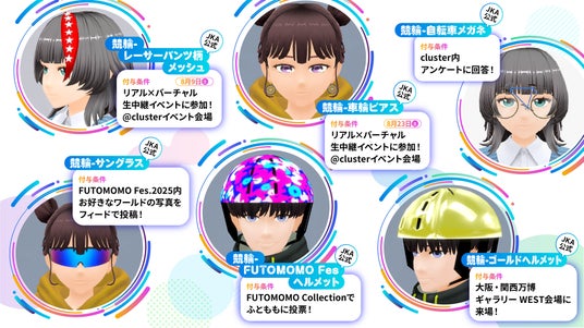 出展期間中に大阪・関西万博会場のギャラリーWESTを訪れることで、「cluster」で使用できる限定アクセサリーをゲットすることができます!「cluster」内のミッションをクリアすることで入手出来るアクセサリーも。ここでしか手に入れられない 「競輪」がテーマのアクセサリーでオシャレしてバーチャルを楽しもう!
