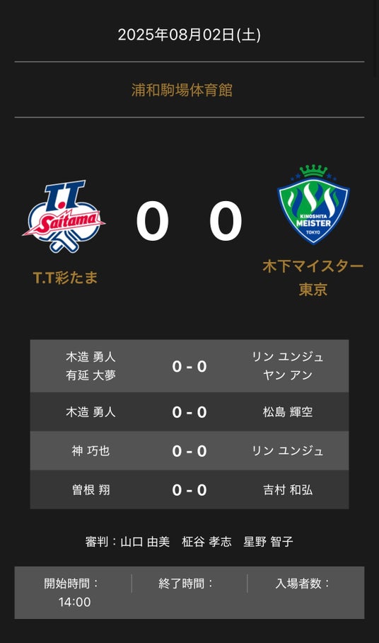 ノジマTリーグ 2025-2026シーズン 公式戦 8月2日開催 「T.T彩たま vs 木下マイスター東京」の対戦オーダーを発表いたします。