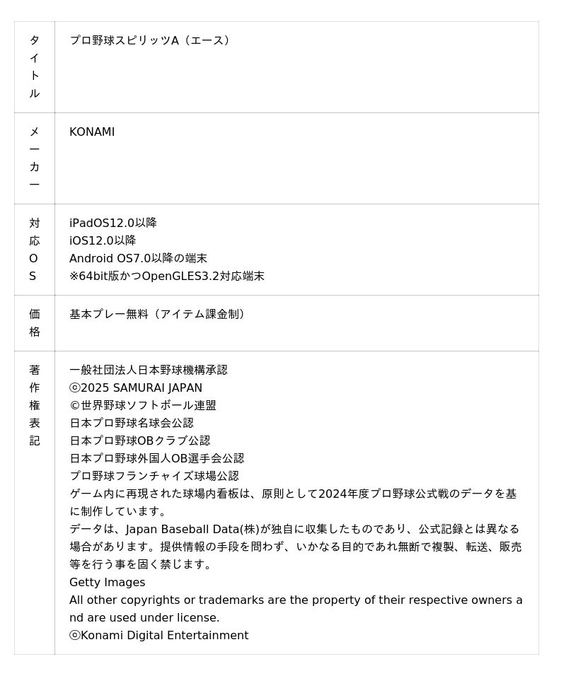 6,400万ダウンロード突破!プロ野球選手を360度から撮影し、そのデータを元に3Dモデルデータとしてゲーム中に再現する「3Dスキャン」技術を採用し、モバイルゲームとは思えない美麗なグラフィックと臨場感を実現。手軽な操作で野球アクションや選手の育成を楽しむことができる、本格派プロ野球ゲームアプリです。プレーヤーは、実在のプロ野球選手を収集・育成して最強のチームを作り、全国のライバルと対戦しながら、優勝を目指します。さらに、試合情報や選手データなどのプロ野球情報も充実。対戦だけでなくプロ野球情報ツールとしてもお楽しみいただけます。モバイルゲーム『プロ野球スピリッツA』公式サイト:https://www.konami.com/games/prospi_a/