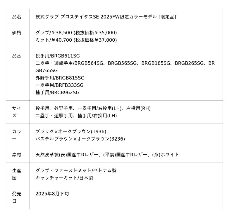 【プロステイタスSE 限定カラーモデル】はグラブに対して強いこだわりを持つ本格派軟式プレーヤーに向けた高い操作性と耐久力を併せ持つ特別仕様バージョンです。今回はカラー限定モデルとして、軟式プロステイタスオーダーでもニーズの高い本体レザーカラーと紐革カラーを組み合わせ、ブラック×オークブラウン、パステルブラウン×オークブラウンの2色を展開します。