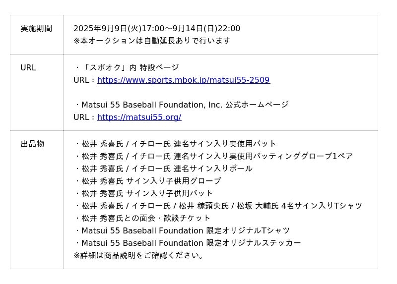 株式会社モバオク(本社:東京都渋谷区、代表取締役社長:小一原 宏樹、以下モバオク)がエンゲート株式会社(本社:東京都中央区、代表取締役:城戸 幸一郎、以下エンゲート)と業務提携し提供するスポーツチーム公式オークションサービス「スポオク」にて、松井 秀喜氏が代表を務めるMatsui 55 Baseball Foundation, Inc.が実施する『Matsui 55 Baseball Foundation 能登半島復興支援チャリティーオークション』を2025年9月9日(火)から開始します。